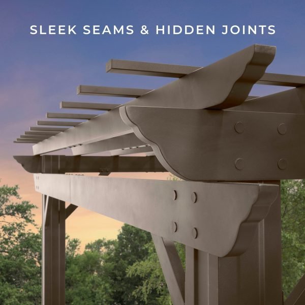 Our Ashford steel pergola is an exquisite fusion of tradition and durability wrapped up in a rustic brown finish. Maintaining a timeless aesthetic, it pairs a meticulously designed framework with a light-filtering sail shade canopy you’ll enjoy year-round.