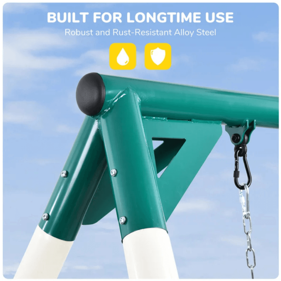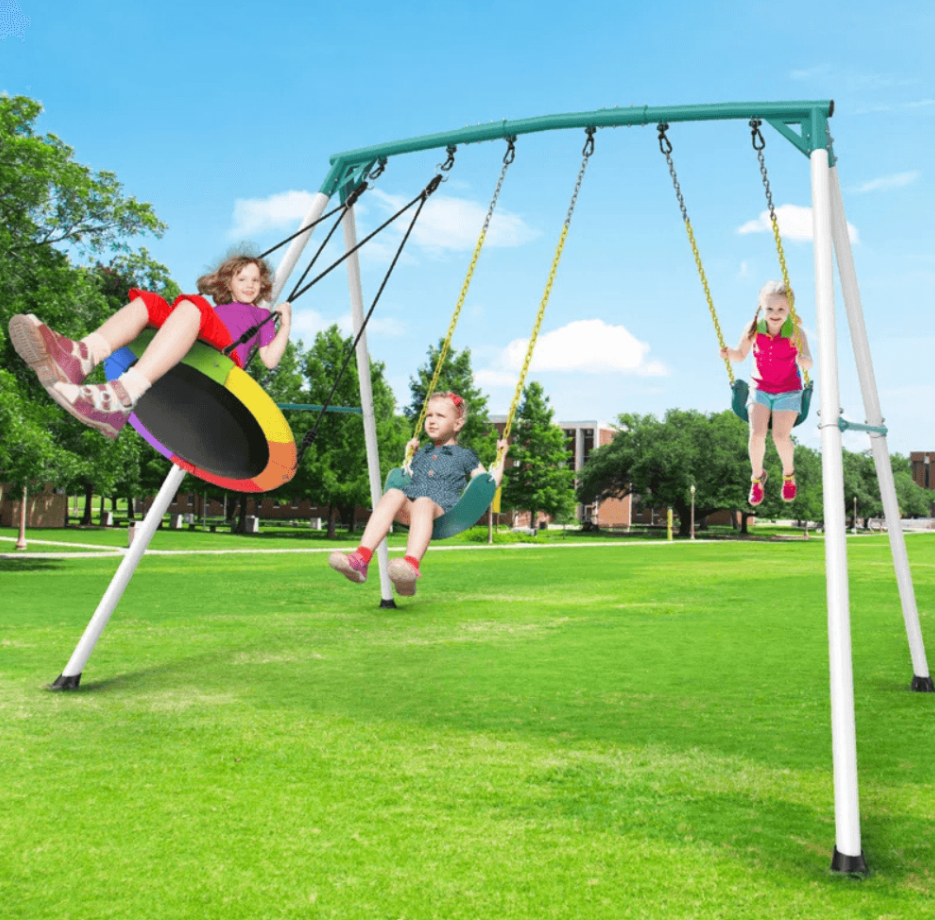 The Heavy-Duty Outdoor Porch Swing Set provides endless outdoor excitement for kids and teens. With three swing seats—including one saucer swing and two EVA belt swings—this versatile set offers thrilling flying fun while also allowing you to easily switch out swings for other attachments. Designed with safety, durability, and easy setup in mind, this swing set is a perfect addition to any backyard.