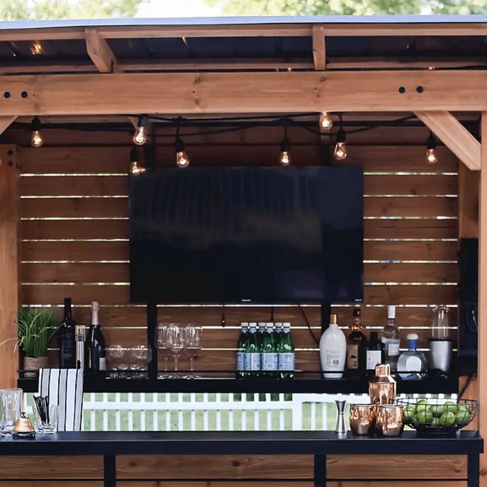 - Resilient & Functional Design: Powder-coated steel bar top and shelving provide a sleek, modern aesthetic. Rust-resistant steel components ensure longevity even in harsh conditions. Cedar privacy wall allows for mounting an outdoor TV, enhancing entertainment options.