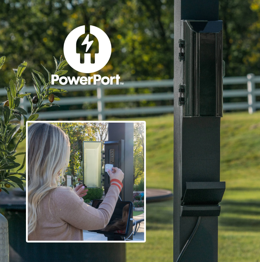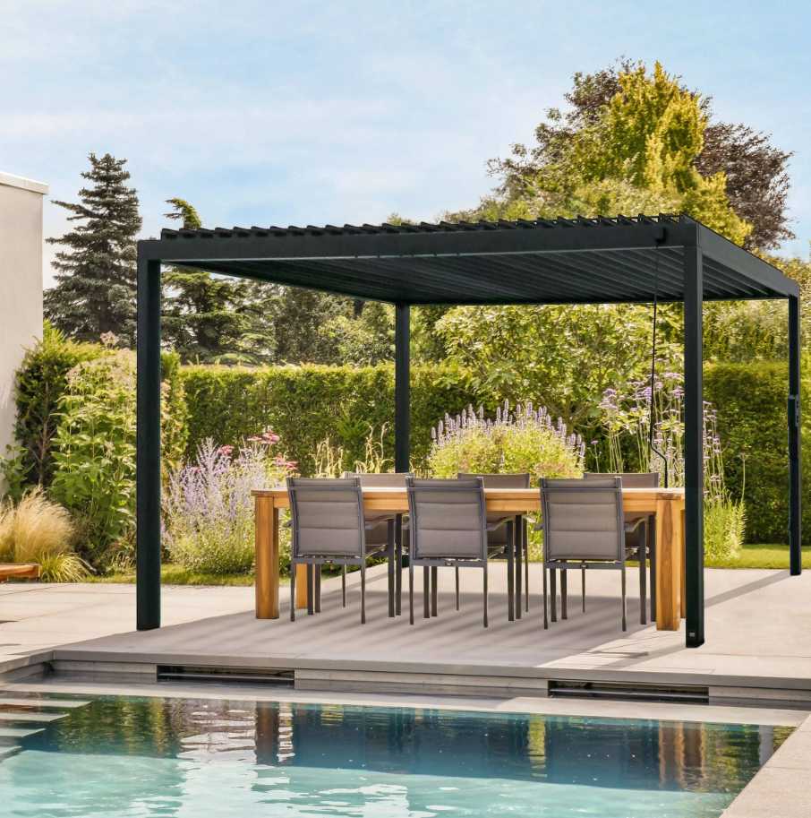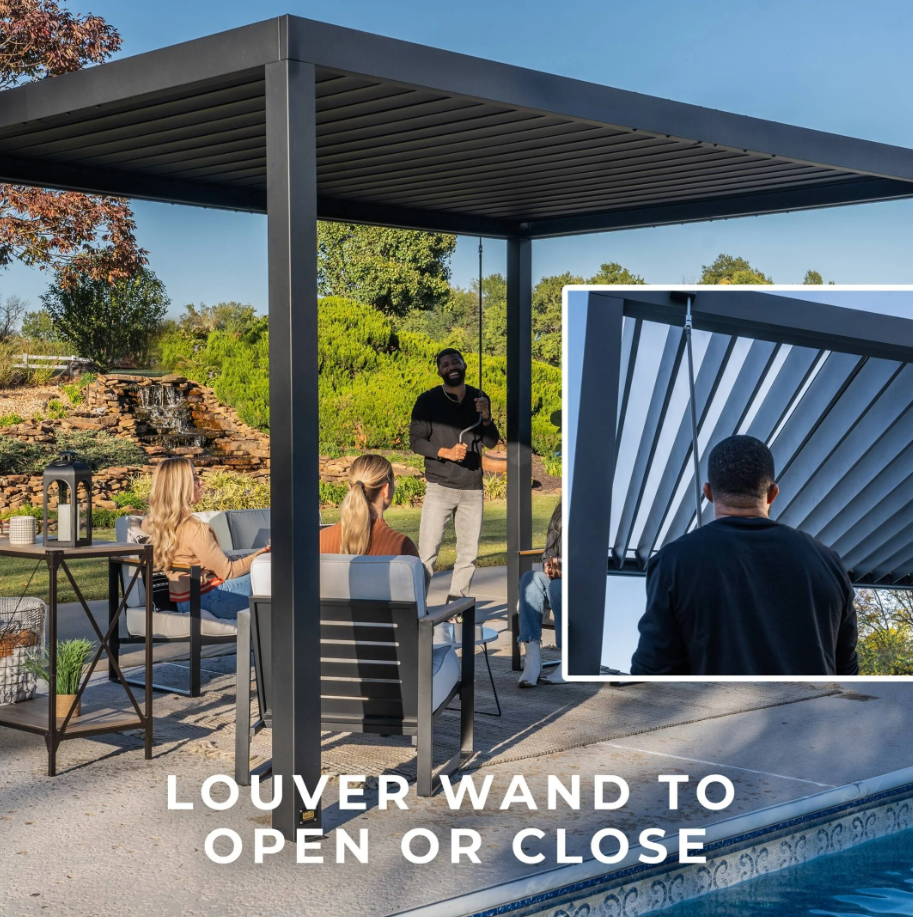 The Sarasota Louvered Pergola elevates your outdoor living space with beautiful modern style. Built with heavy-duty, galvanized steel, its adjustable louvers can be easily opened to allow filtered sunlight through or closed completely to enjoy shade and weather protection. Complete with powder-coated steel posts and anchoring plates, the Sarasota is Pro-Tect™ tested and proven to withstand up to 3,100 pounds of roof weight and 100 mph wind speeds*, ensuring a lasting upgrade to your backyard. The integrated drainage system directs rainwater to downspouts in the steel posts and is equipped with gutter guards to prevent debris blockages. The 100% galvanized powder-coated steel is not only completely maintenance free but is also rust and corrosion-resistant for contemporary charm that’s built to last. Boasting sleek lines and an elegant black finish, this contemporary patio pergola accommodates seating, tables, and decor for a stylish, comfortable outdoor living space. With our patented PowerPort™, featuring three electrical outlets and USB ports, it’s easy to connect lighting, music, devices, and more. This outdoor pergola kit is ready to assemble and offers guided instructions through the BILT® app for easier installation