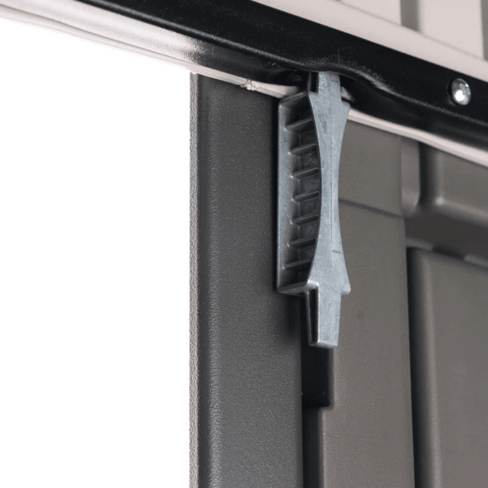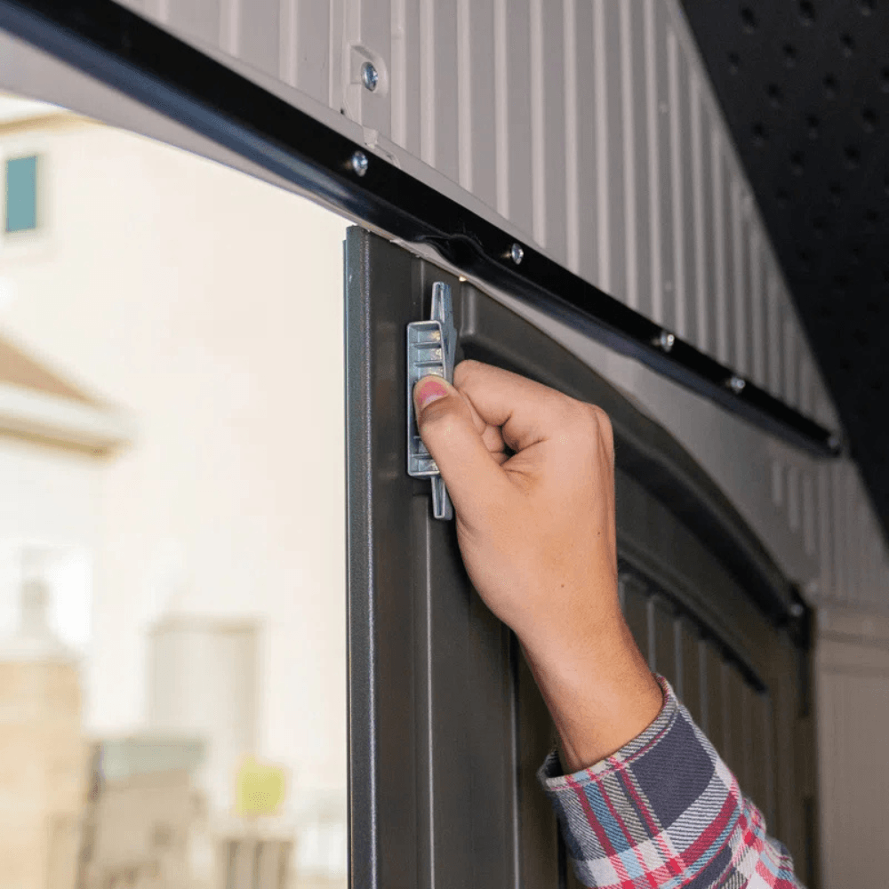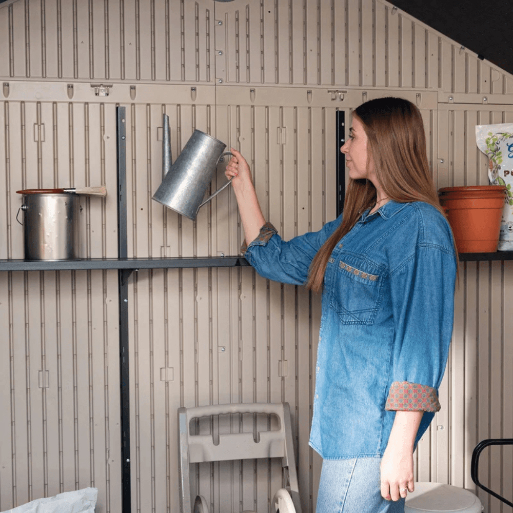 Its UV-protected, weather-resistant construction and high-pitched roof for efficient water drainage make it an ideal year-round storage solution. With built-in shelving, skylights, and steel-reinforced, lockable double doors, this shed provides security, functionality, and convenience—all in one.