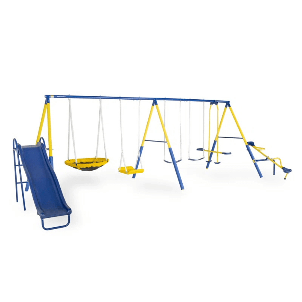 Built with durable, rust-resistant metal, this bright and colorful blue-and-yellow swing set is engineered for safety, stability, and long-lasting use. It’s the perfect backyard playground solution for families looking to encourage active outdoor play while making lifelong memories together.